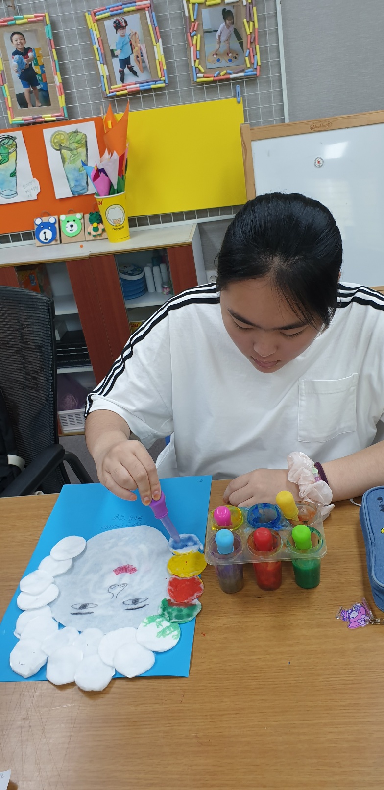 방과후 애들이 물감으로 색칠을 하고있어요!